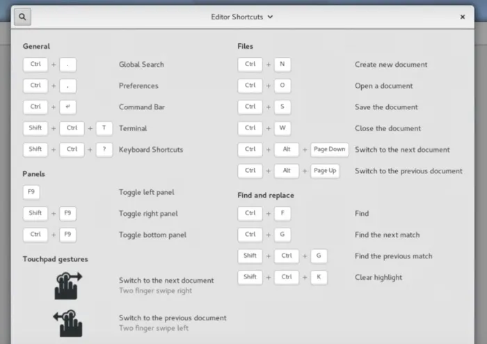 - 多数核心应用支持键盘快捷键和手势,可以在应用中按下 Ctrl + F1 来调出“快捷键窗口”,显示所有可用的快捷键和手势