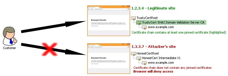 这种机制可以用于防护攻击者运行一个假冒网站并使用有效证书来欺骗浏览器的攻击行为。
