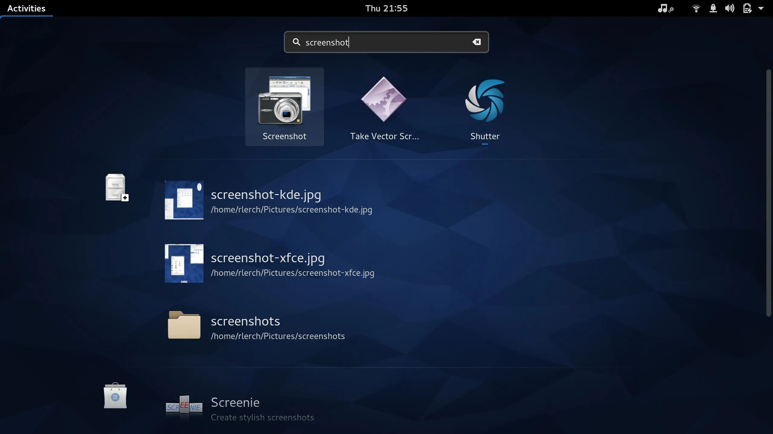 在 Fedora 工作站中, 通过在 activities overview 中搜索 screenshot 来启动 Screenshot 。也可以在 applications 视图中找到(在 Utilities 文件夹)。