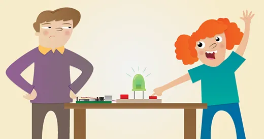 接下来试着接通两个按钮和 LED 灯的电源,实现一个双玩家的反应游戏 —— 让 LED 灯随机时间点亮,然后看是谁抢先按下按钮。