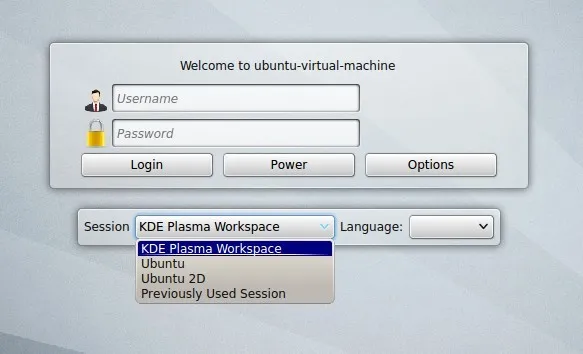 填入您的用户名和密码,打开选项按钮,然后您就可以选择 KDE 桌面登录了。
