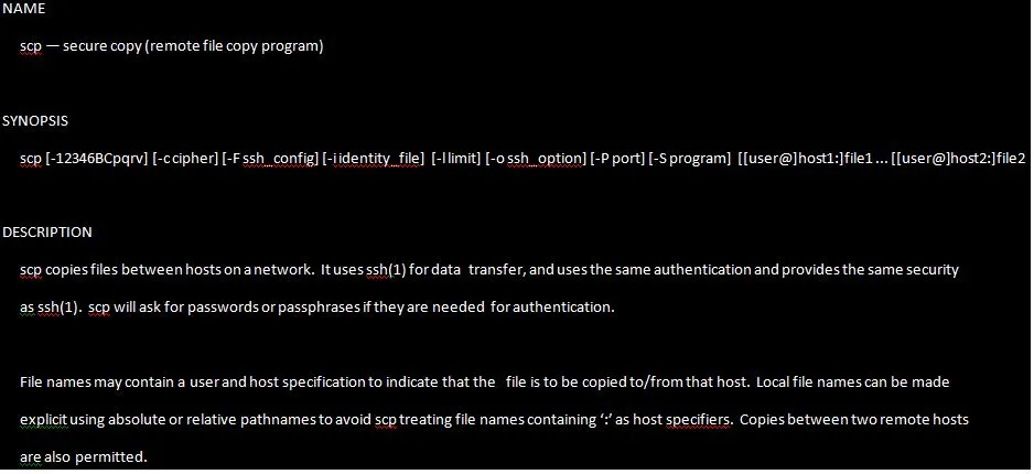 你也可以像 cp 命令一样,在 scp 命令中使用不同的选项,scp 的 man 帮助详细地阐述了不同选项的用法和用处。