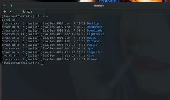 如果你打开一个终端并运行命令 ls -l,你将会看到逐行列出当前工作目录下所有的文件和文件夹的列表(如图)