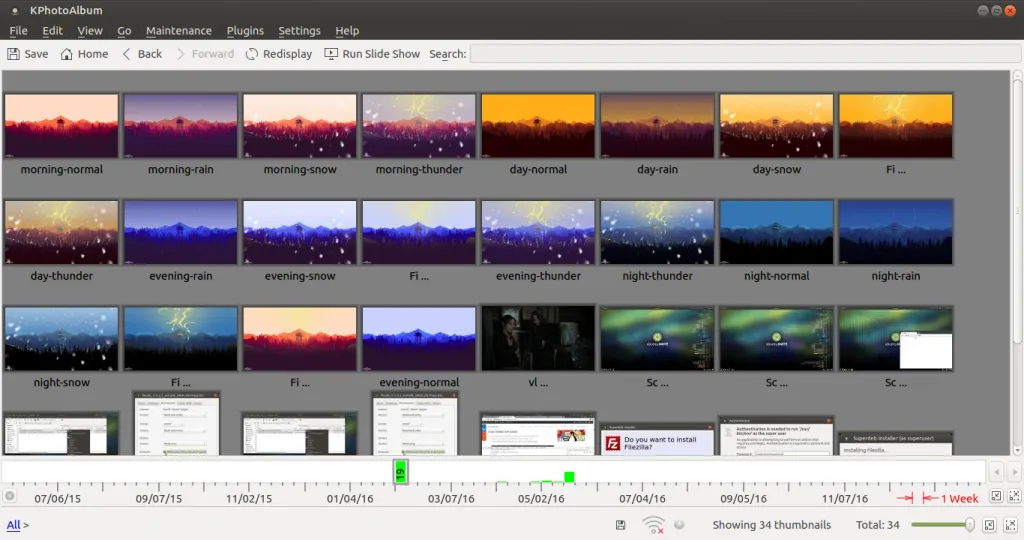 KPhotoAlbum 是一款在 KDE 桌面环境下的图像管理应用。它有一些独特的功能:分类和基于时间浏览。你可以基于人物、地点、时间分类;另外在用户图形界面底部会显示时间栏。