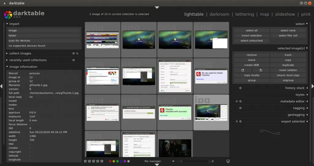 Darktable 与其说是图像管理工具,不如说是图像编辑软件。Darktable 有良好的用户图形界面,对桌面环境没有特殊的要求,这也不会影响到它的图像编辑功能。它的基本功能如下: