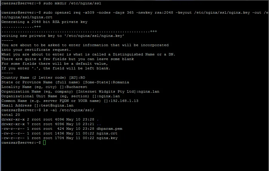 $ sudo openssl req -x509 -nodes -days 365 -newkey rsa:2048 -keyout /etc/nginx/ssl/nginx.key -out /etc/nginx/ssl/nginx.crt