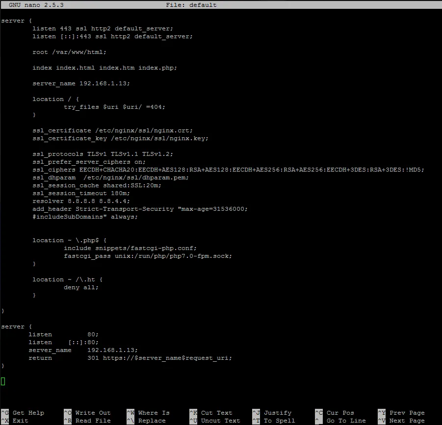 上述添加到服务器配置的最后一段,是用来将所有非 SSL 的流量重定向到 SSL/TLS 默认主机。然后用你主机的 IP 地址或者 DNS 记录(最好用 FQDN 名称)替换掉 server_name 选项的参数。