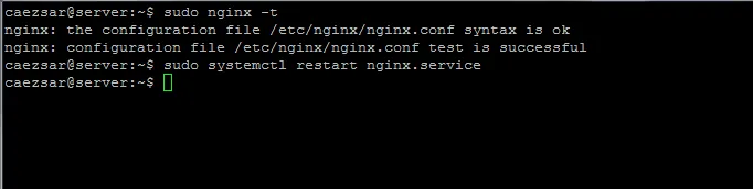 7、 当 Diffie-Hellman 密钥生成之后,验证 Nginx 的配置文件是否正确、能否被 Nginx 网络服务程序应用。然后运行以下命令重启守护进程来观察有什么变化。