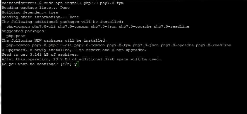 9、 在你的服务器控制台里输入下面的命令来获取 PHP7.0 和扩展包,这能够让 PHP 与 Nginx 网络服务进程通信。