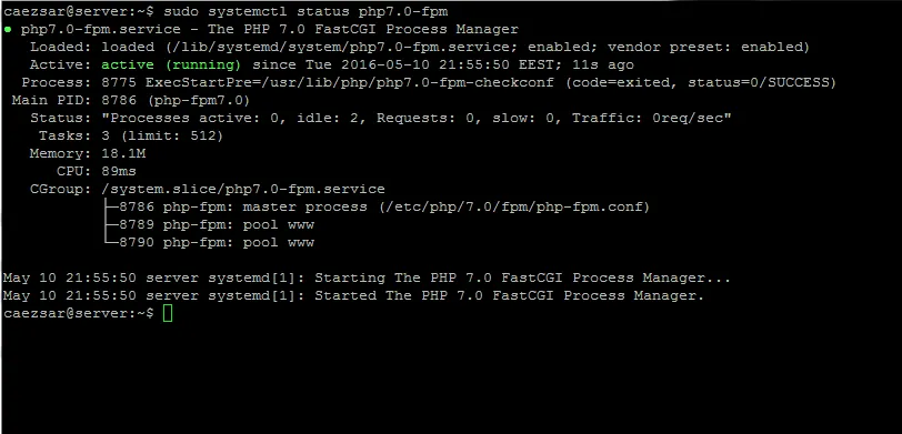 10、 当 PHP7.0 解释器安装成功后,输入以下命令启动或者检查 php7.0-fpm 守护进程: