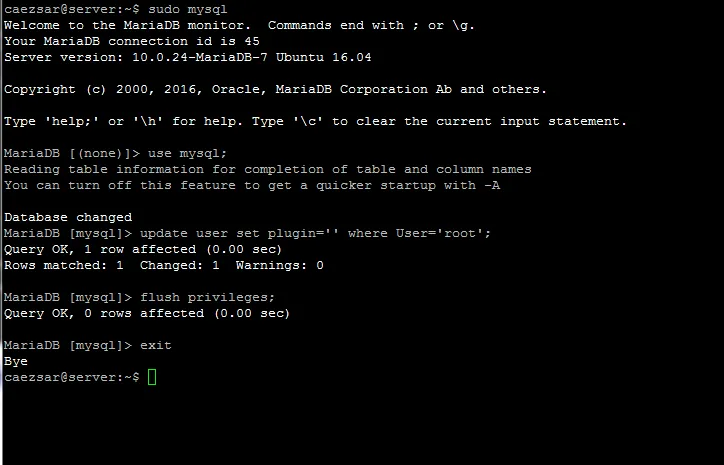 MariaDB> update user set plugin=’‘ where User=’root’;