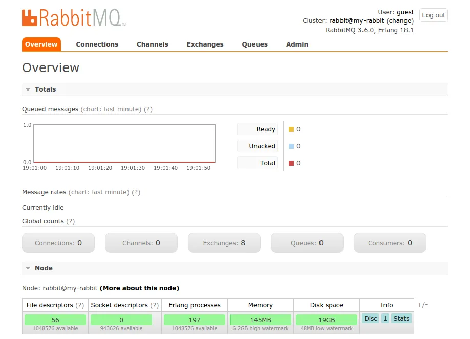 在浏览器中访问 http://localhost:15672 ,如果能够使用 guest:guest 验证信息登录 RabbitMQ 的控制面板,说明它已经在你的开发环境中运行起来了。