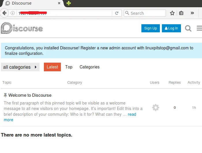现在打开浏览器,如果已经做了域名解析,你可以使用你的域名来连接 Discourse 页面 ,否则你只能使用IP地址了。你将看到如下信息: