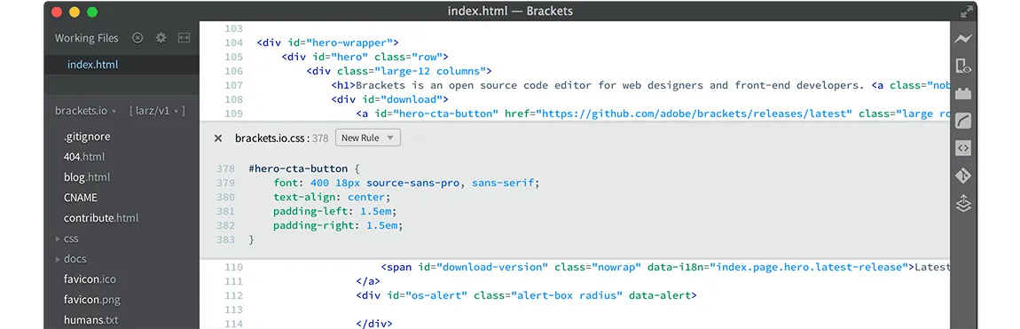 Brackets 是一个现代化风格的、开源的文本编辑器,专为 Web 设计与开发打造。它可以通过插件进行高度扩展,因此 C/C++ 程序员通过安装 C/C++/Objective-C 包来使用它来开发,这个包用来在辅助 C/C++ 代码编写的同时提供了 IDE 之类的特性。