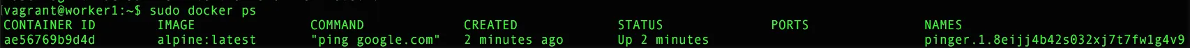 sudo docker service create --replicas 1 --name pinger alpine ping google.com