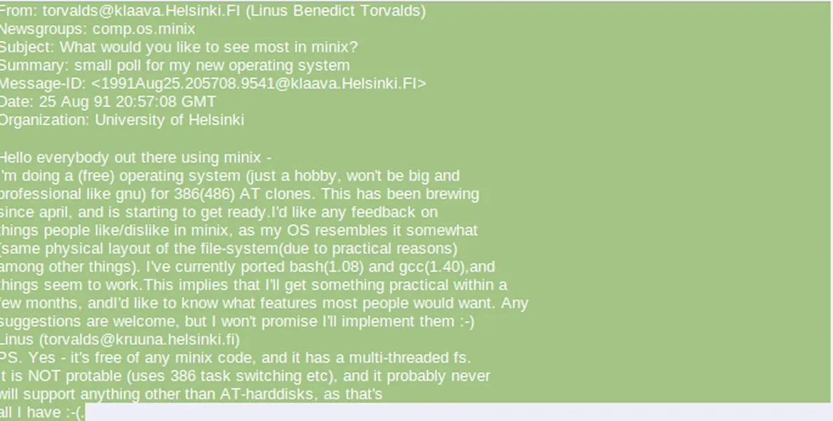 这封邮件是 1991 年 8 月 25 日 Linus 发在 Minix Usenet 新闻组的,这个日期通常被认为是 Linux 的生日。那时候 Linus 还没有什么名气,他说它的新操作系统“只是一个兴趣,并不想着像 GNU for 386(486) AT 那么庞大和专业。”
