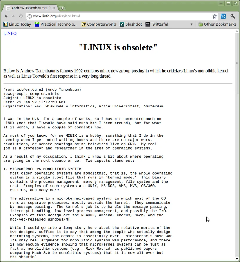 Andrew Tannenbaum 是一位操作系统专家,也是当时著名的 Minix 操作系统的作者,这是一个用于教学用途的 Unix 版本。Andrew 声称 “LINUX 是过时的”,从而打响了 Linux 的第一次操作系统之战。在由此而来的论战中,Linus 发表了一个至今看起来仍然正确的观点,“如果 GNU 内核(指 Hurd,这是另外一个尝试建立自由的类 Unix 操作系统的项目)去年春天就已经好了的话,我绝不会启动我的项目:事实上它根本没有完成,估计永远也完成不了。Linux 能胜出的很大原因就在于它现在就能用!”