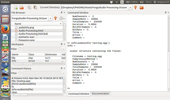 在本教程中我会使用 ogg 文件来读取这种文件的属性,比如采样、音频类型(stereo 和 mono)、信道数量等。必须声明的一点是教程中使用的所有的命令都是在 Octave 终端窗口中执行的。首先,我们必须要把这个 ogg 文件赋给一个变量。注意:文件必须在 Octave 的工作路径中。
