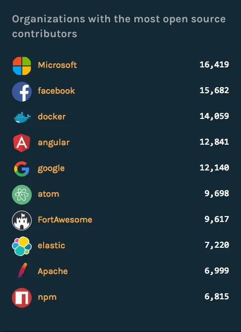 开源贡献者最多的组织是微软,超过了 Facebook、docker,以及谷歌。看来微软这一年确实是在开源方面下了死力。