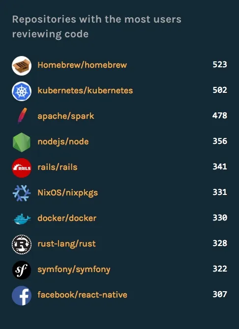这里的 代码评审者 指的是对修改过的代码进行过评论的人,这也代表贡献者对仓库的关注度。好吧。我除了对第一名 homebrew 有点不解,其它的几名都觉得还算正常。