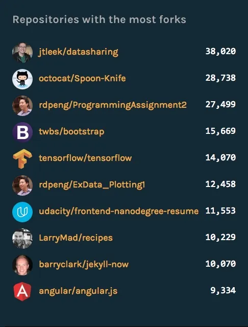 仓库被 分支 的越多代表了对它感兴趣、甚至会参与到开发中的人越多。这个排名第一的 datasharing 是个啥项目,我去看看——居然是一篇文章……好吧,让我看看第二个 Spoon-Knife,这,是章鱼猫的一个教人如何分支仓库的例子……那么第三个 ProgrammingAssignment2 ,哎,也是一个课程上用的例子……