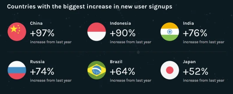 而中国,是新用户注册增长最多的国家,基本上翻了一番。