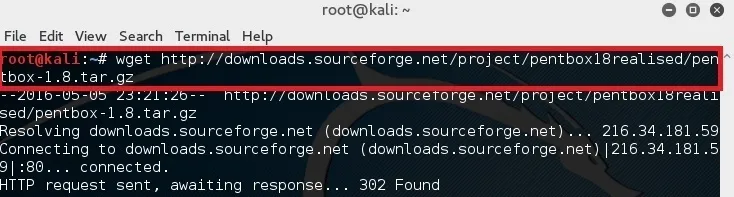 root@kali:~# wget http://downloads.sourceforge.net/project/pentbox18realised/pentbox-1.8.tar.gz