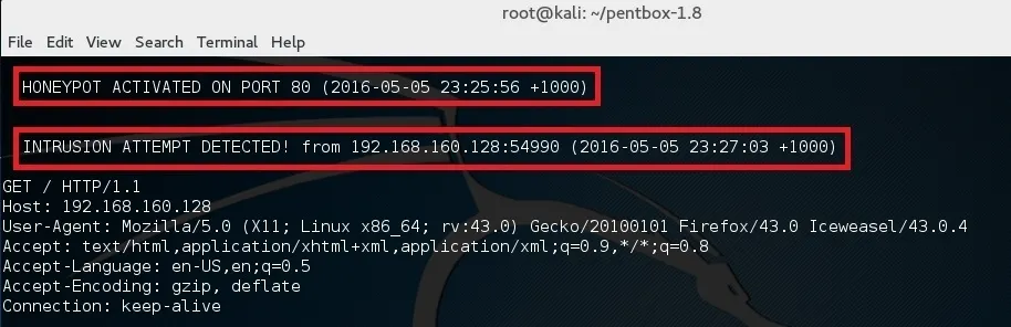 并且在你的终端应该会看到 “HONEYPOT ACTIVATED ON PORT 80” 和跟着的 “INTRUSION ATTEMPT DETECTED”。