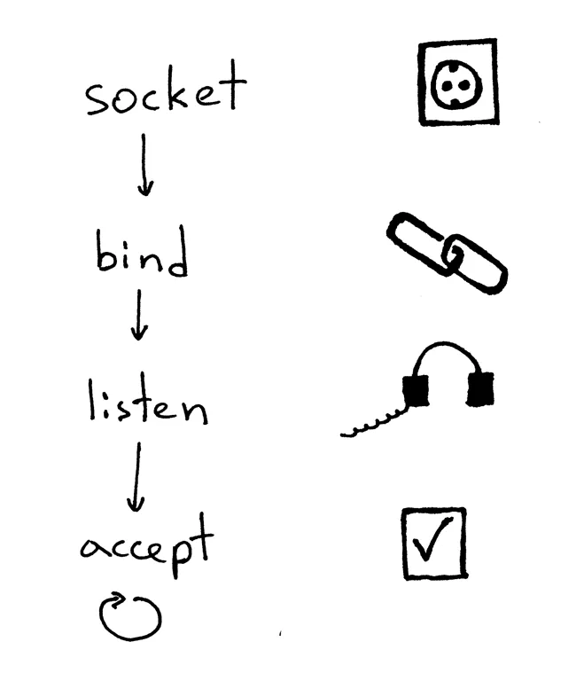 一个服务器创建一个套接字并开始建立连接的基本工作流程如下: