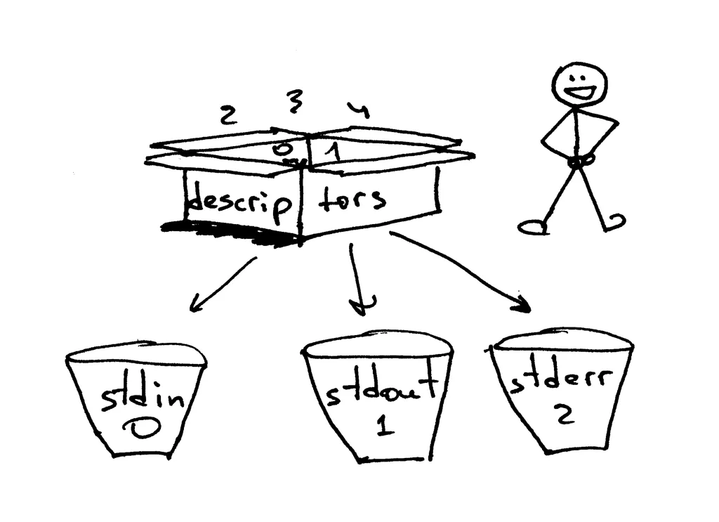 一般情况下,UNIX shell 会将一个进程的标准输入流(STDIN)的文件描述符设为 0,标准输出流(STDOUT)设为 1,而标准错误打印(STDERR)的文件描述符会被设为 2。
