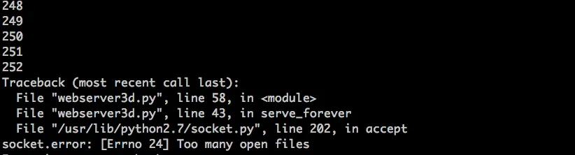 好的,一切顺利。是不是没问题了?额,几乎是。重新尝试运行 webserver3f.py 但我们这次不会只发送一个请求,而是同步创建 128 个连接: