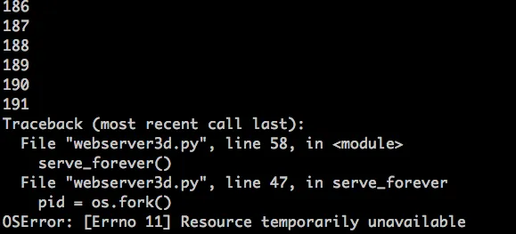 然后,过一会,你的服务器进程应该会再次爆了,它会在创建新进程时抛出一个 OSError: 资源暂时不可用 的异常。但它并没有达到系统允许的最大进程数。这是我的环境中输出的异常信息截图: