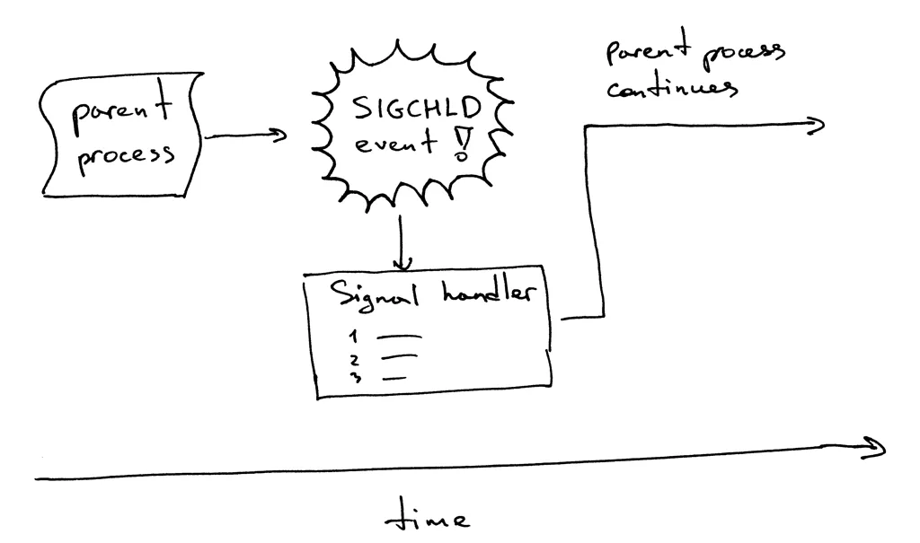 这是它的工作流程。当一个子进程退出时,内核会发送 SIGCHLD 信号。父进程可以设置一个信号处理器,它可以异步响应 SIGCHLD 信号,并在信号响应函数中等待(wait)子进程收集终止信息,从而阻止了僵尸进程的存在。