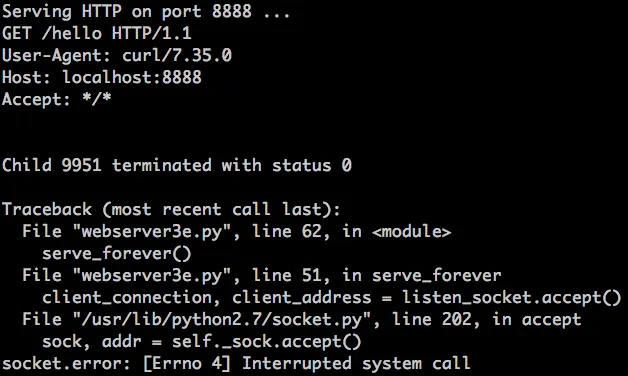 别担心,这个问题很好解决。你只需要重新运行 accept 系统调用即可。这是修改后的服务器代码 webserver3f.py,它可以解决这个问题: