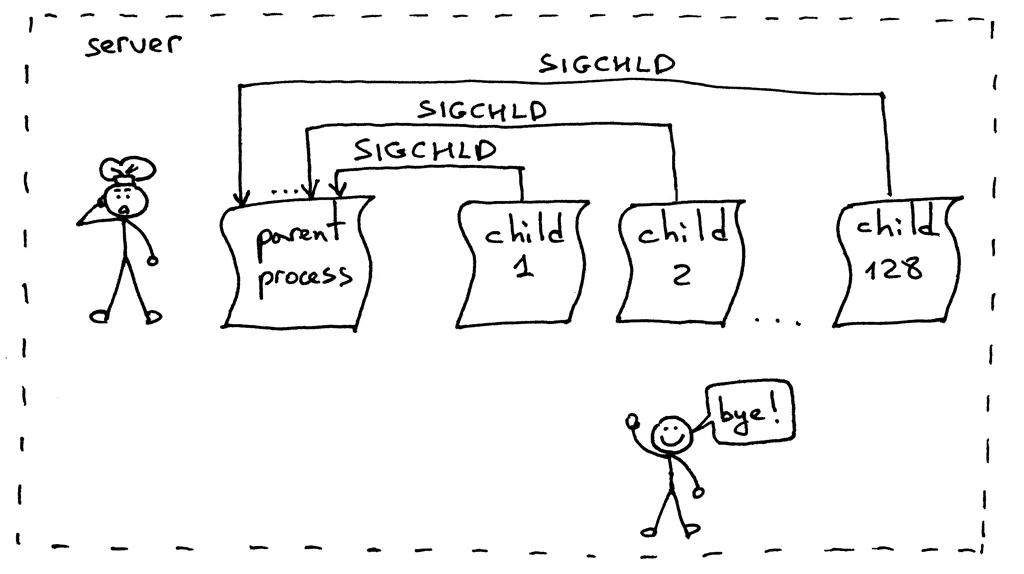但是,即使你关闭了描述符副本,你依然没有摆脱险境,因为你的服务器还有一个问题,这个问题在于“ 僵尸 ”!