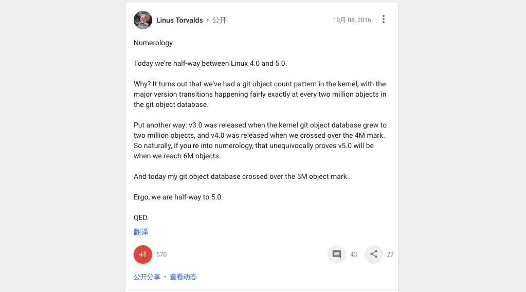 “现在我们正处于 Linux 4.0 和 5.0 中间,”Linus Torvalds 说,“换句话说: 3.0 发布于内核 Git 对象数据库有 2 百万个对象时,而 4.0 发布于 4 百万时。所以,很自然的,按数字来说,毫无疑问 5.0 应该在我们到达 6 百万对象时发布。”