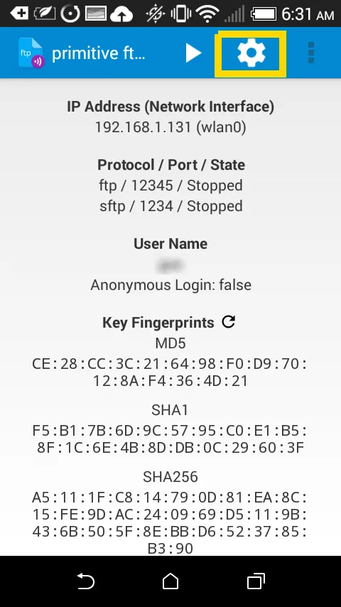 打开应用之后,你将看到一大串的数字。不用紧张,你可以看到服务端已经分配到一个 IP 地址 (本文是 192.168.1.131)。往下看,将看到 FTP 和 SFTP 服务 (SFTP 是一个截然不同的协议,它通过 SSH 进行连接) 都是还未运行的。再往下就是用户名,本文设置为 user。