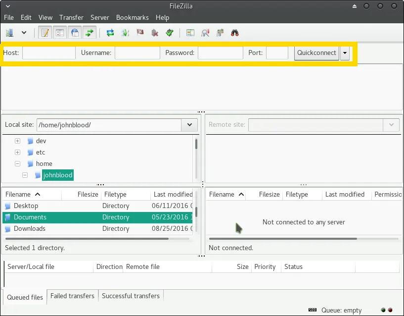 如果你想要手动输入,直接在 Filezilla 窗口上方输入必要的信息然后点击“快速连接”即可。