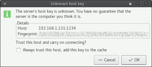 点击连接,输入密码即可。你会看到一个连接新主机的警告,这是可以在此验证屏幕上显示的“指纹信息”是否与 Primitive FTPD 上的一致。如果一致 (也应该是一致的),点击确认添加都已知主机列表,之后就不会出现该警告了。