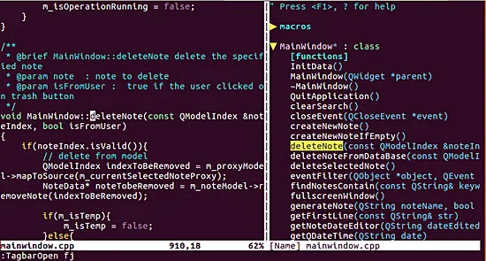 安装完之后就可以使用了,你可以在 Vim 中打开一个 .cpp 文件来测试它:进入命令模式,然后运行 :TagbarOpen 命令。以下是运行 :TagbarOpen 命令之后出现侧边栏(右侧) 的效果图。