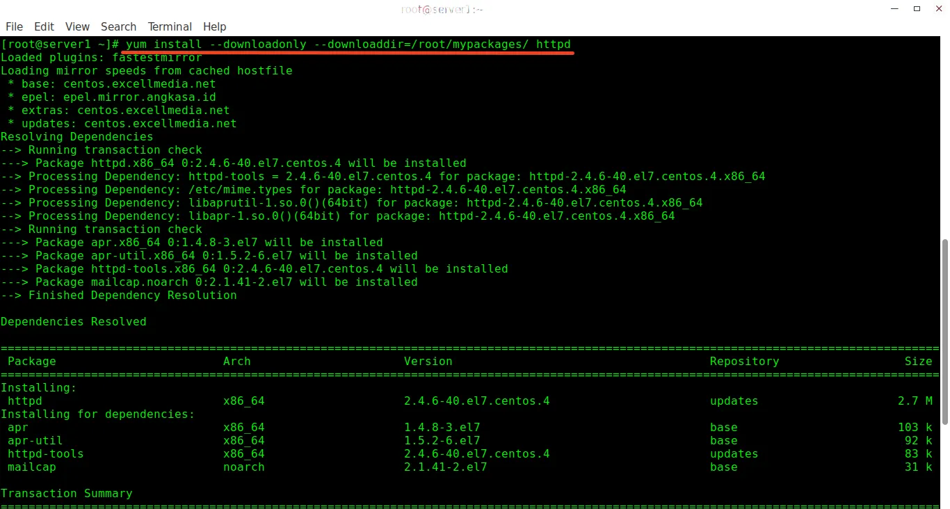 正如你在上面输出所看到的, httpd软件包已经被依据所有依赖性下载完成了 。