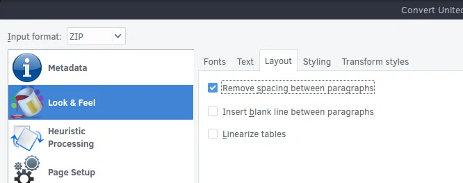 在新窗口的右上部选择框中,选择 epub 文件格式。Calibre 也有创建 mobi 文件格式的其它选项,但是我发现创建那些文件之后经常出现我意料之外的事情。
