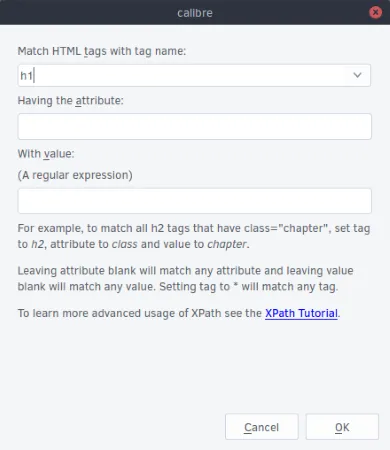 在这个新的窗口中,在“ 匹配 HTML 标签 ”下的下拉菜单中选择“h1”。点击“OK” 来关闭这个窗口。如果你有子章节,在“ 二级目录 ”下选择“h2”。