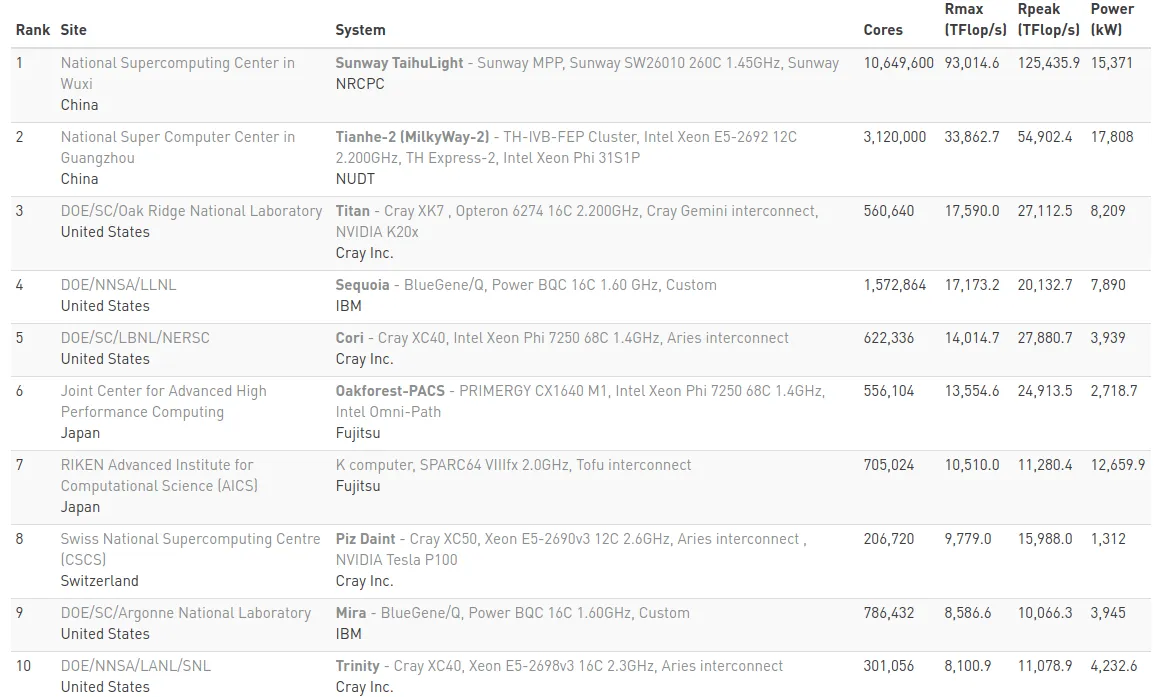 在速度前十的超级计算机中,美国占据了 5 台,日本和中国各有 4 台,瑞士有 1 台。想说的是日本和中国一共有4台吧