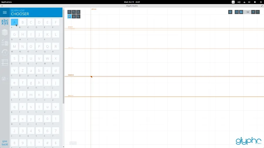 完成进入编辑界面后, 你可以从屏幕左边的面板中选择字母,然后在右边的绘制区域设计。我选择 A 字母的图标开始编辑它。