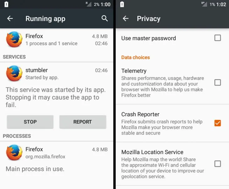 对于 Android 上的 Stumbler 服务,由于是一个服务(而不是进程),您可能无法在运行的进程/最近的应用程序列表中看到它。 因此,使用专用应用程序关闭它或启用“开发人员选项”,并转到“运行服务” -> 点击 Firefox,最后,停止“stumbler”。