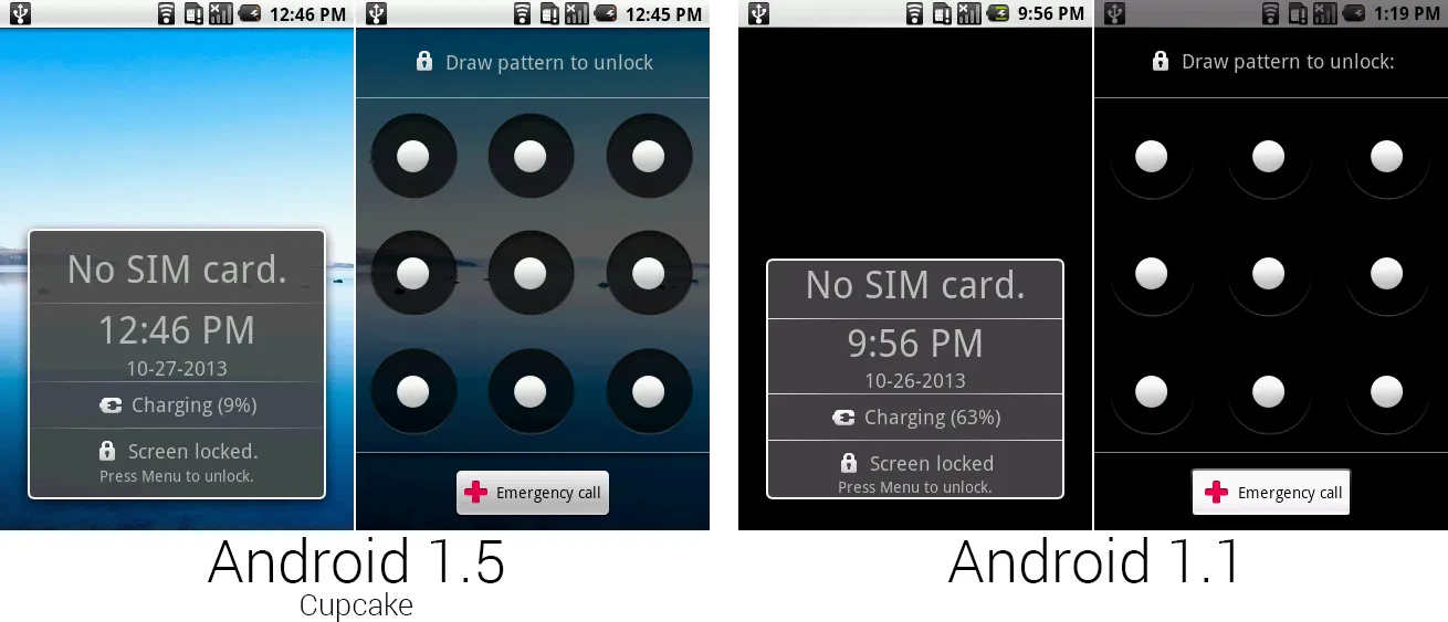 图形解锁界面的浅色背景显示出了谷歌在圆圈对齐工作上的草率和马虎。白色圆圈在黑圆圈里从来都不是在正中心的位置——像这样基本的对齐问题对于这一时期的安卓是个频繁出现的问题。