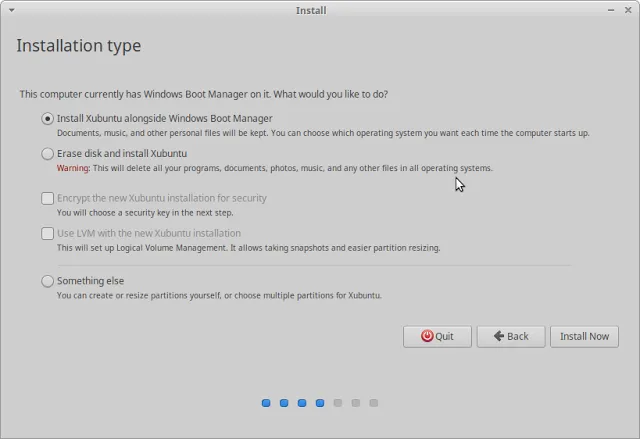 如果你有一个备用的未分配的磁盘分区和并且安装了 Windows,您将看到可以选择在已有 Windows 的情况下安装 Xubuntu 并设置双启动。