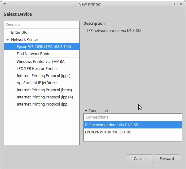 我有一个爱普生 WF-2630 无线打印机。 Xubuntu 能够直接找到这台打印机,并安装相关驱动。