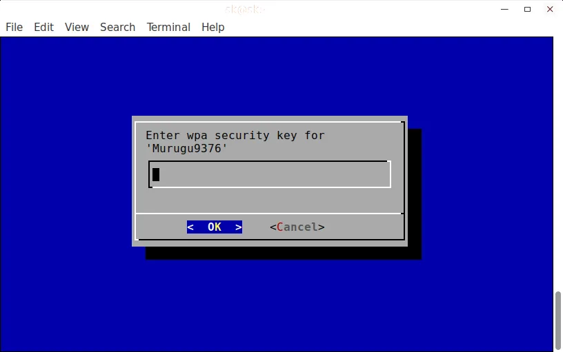 我的 WiFi 网络名为 Murugs9376。我选中了我的 WiFi 网络,然后在 OK 处按下回车。它没有让我输入新的 WiFi 密码(我以为它会先问我是否密码已经更改),却显示了下面的错误。